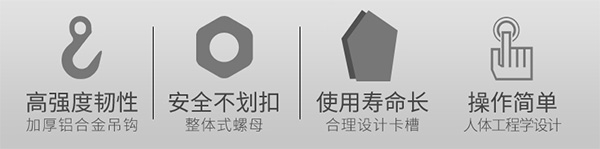 獨特的彈性離合器技術(shù),可在任意高度吊起貨物;輕盈的手拉裝置、起升率高;新型設(shè)計的鍛打式吊鉤,吊鉤頂端更為安全,且具有緩慢彎曲性能。
